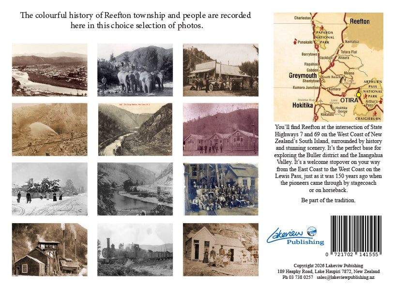 Historical images from the Reefton district feature in this 2026 calendar, with one month to an A4 landscape page. Each month lists public holidays. Two pages contain historical snapshots of Reefton history and personalities.