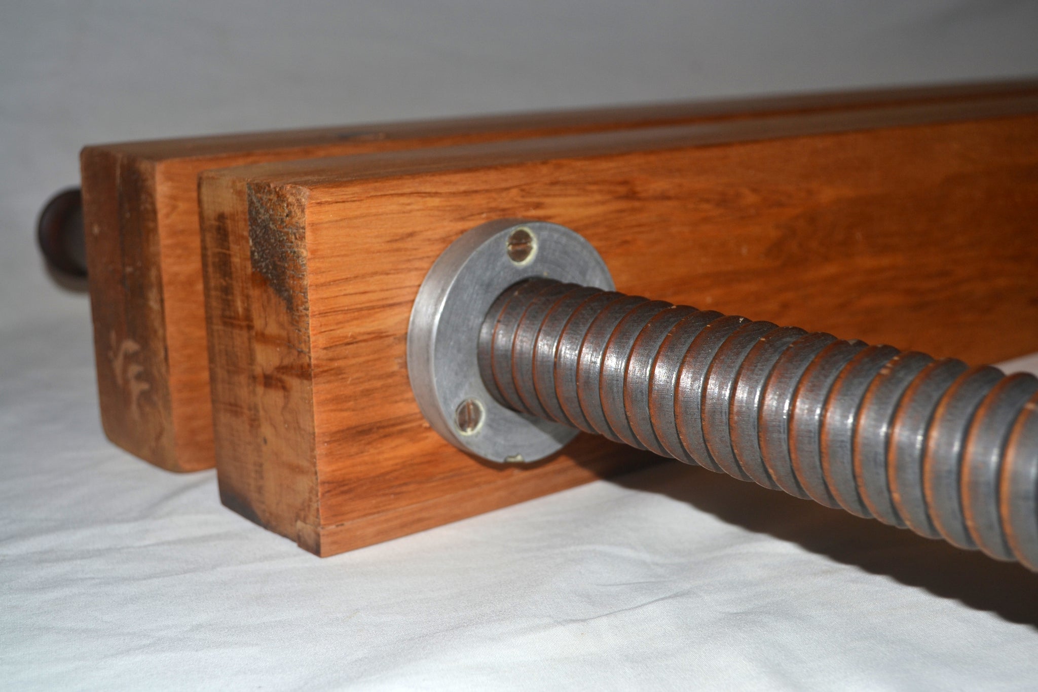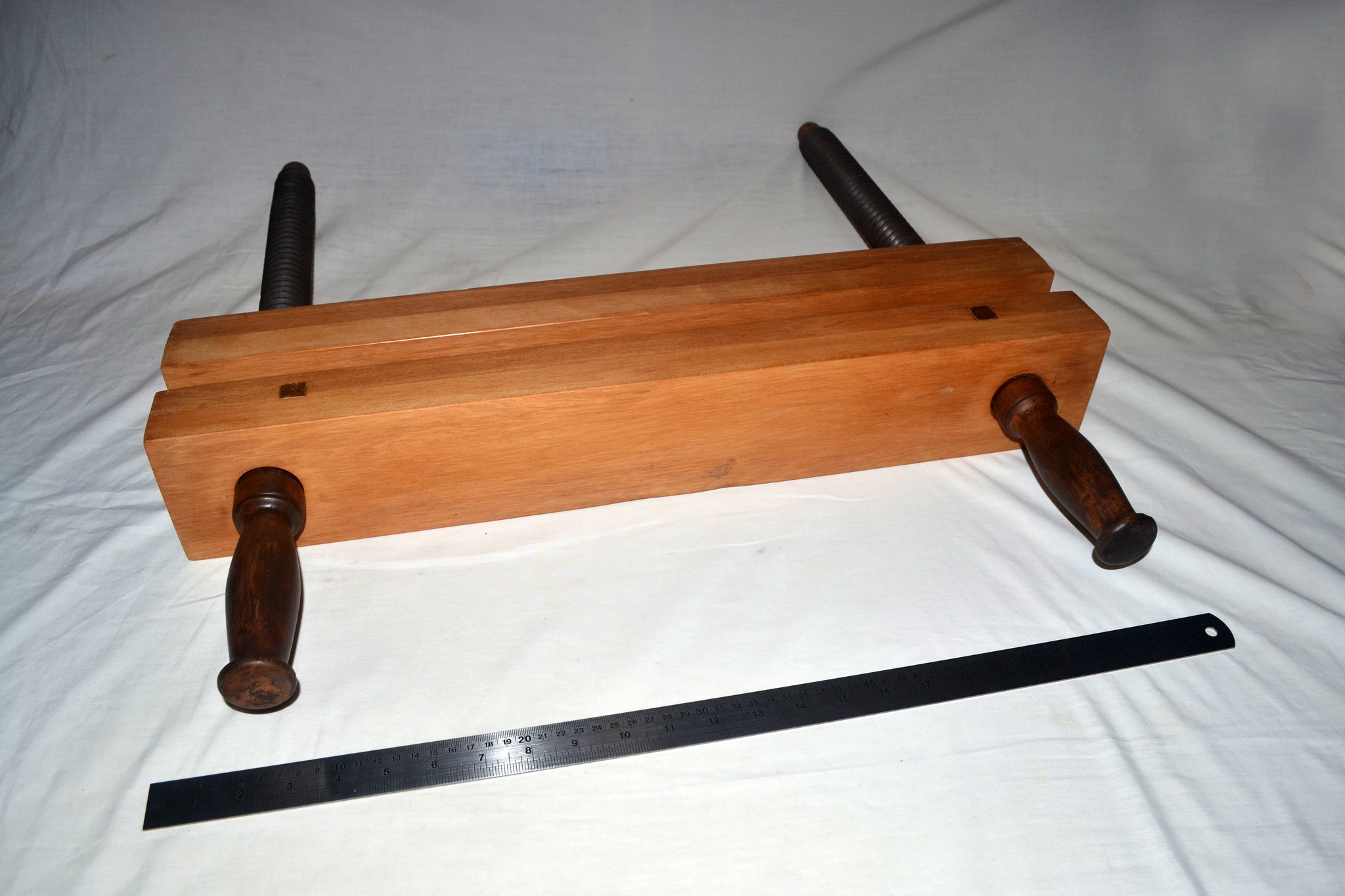 Made of rimu blocks with 1 1/4 inch diameter wooden screws. The screws tighten into aluminium nuts set into the other block. This is a robust and classical piece of gear. The long screws allow for packing in several page sets for perfect binding.