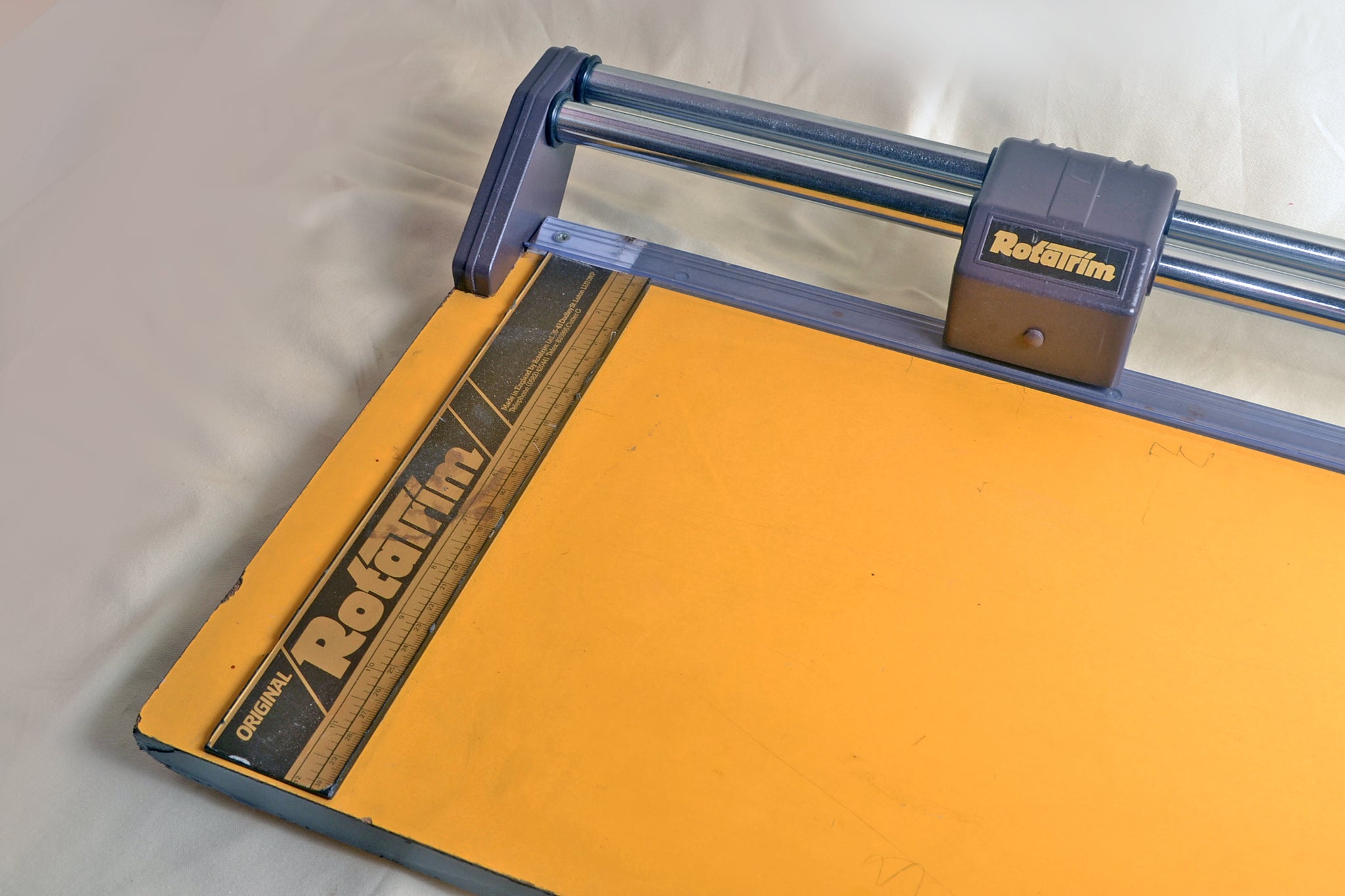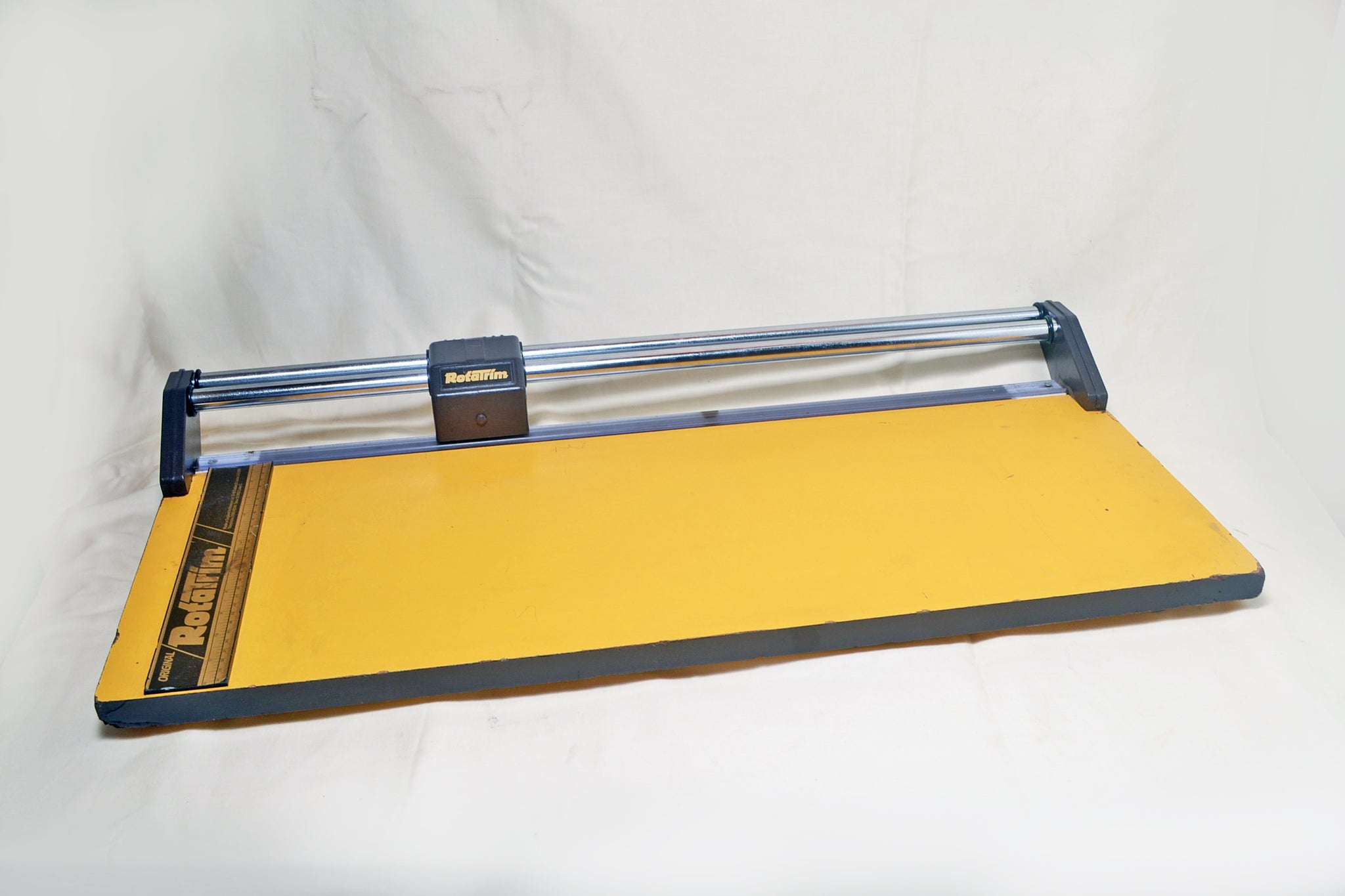 This restored Rotatrim paper trimmer has a cutting length of 620mm. In excellent condition, with an optional self-adhesive sheet of gridlines available. We have found the gridlines a very useful tool in lining up paper for a parallel cut. To install the grid, simply line it up along the cutting edge and peel off the backing paper while pressing it into position.